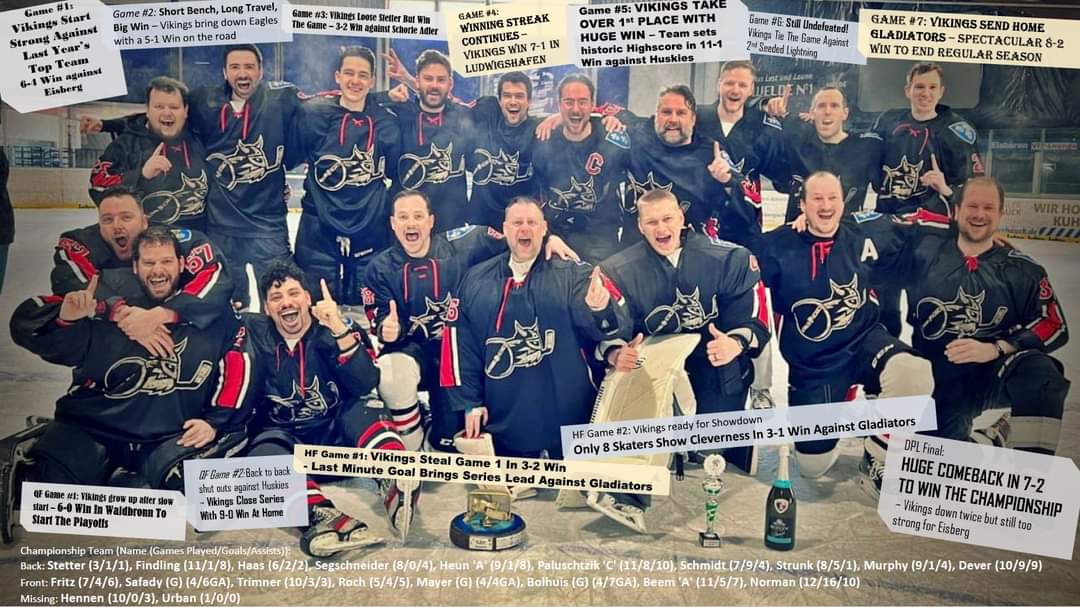 The Vikings White team concluded their season on March 26 with a dominant 7-2 victory in the DPL 5 championship game. The win capped off an undefeated season. They went into the championship game against Eisberg after having only narrowly beaten them in the regular season opener. Eisberg had also just beaten Lightning Wiesloch in their best-of-three semi-final. Lightning Wiesloch were the only team the Vikings did not beat during the regular season, managing only a 1-1 tie. Led by captain Jannik Paluschtzik, the team approached the final game focused and without underestimating their opponent. Eisberg opened the scoring, but the Vikings did not let that discourage them. Minutes later Chris Norman, the team’s leading scorer, tied it up. In the second period Eisberg scored again to take the 2-1 lead before the Vikings responded with a goal from rookie Tino Strunk. A powerplay resulted in the tie-breaking game winner scored by Joel Dever. The Vikings then took control of the game and ultimately scored 4 more in the victory (Paluschtzik, Dever, Strunk, Beem).